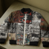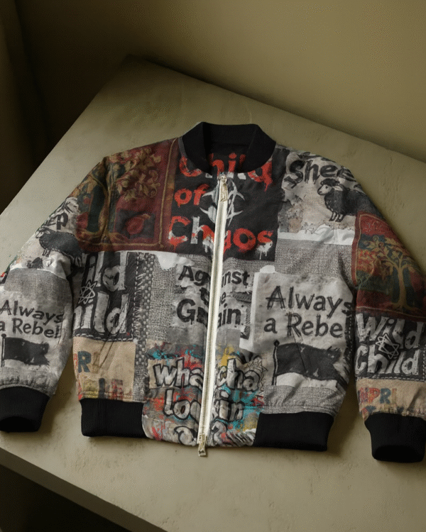 Feel the difference as 240 GSM premium poly brushed fleece cocoons you in cozy warmth—the plush touch and heavy feel making this jacket a statement for all seasons. The all-over, fade-proof print collages rebellious slogans, punk patchwork art, and denim textures, evoking an era of outsider culture and downtown grit that stands out from the crowd. Classic bomber details—two pockets, lycra ribbed hem and cuffs, reliable YKK zipper—are leveled up by the personality-packed graphic, turning every fit into a conversation about what it means to go your own way